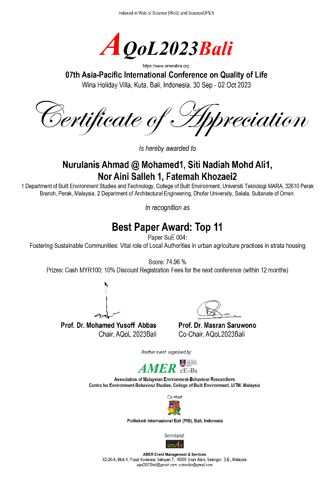 وقد أشاد المؤتمر، الذي نظمته رابطة الباحثين الماليزيين في مجال البيئة والسلوك، بالجهود التعاونية التي بذلها مؤلفو الورقة المكون من نورولانيس أحمد، وستي نادية محمد علي، ونور عيني صالح، من قسم دراسات البيئة المبنية والتكنولوجيا في جامعة مارا التكنولوجية، ماليزيا، وفاطمة خزاعي من قسم الهندسة المعمارية في جامعة ظفار، عمان. والذين أسفرت جهودهم المشتركة عن ورقة تؤكد الدور المحوري للسلطات المحلية في تطوير ممارسات الزراعة الحضرية داخل المجمعات السكنية متعددة الأسر.