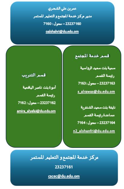 يطمح مركزخدمة المجتمع و التعليم المستمر في جامعة ظفار إلى مساعدة مجتمع ظفار في حل القضايا المحلية ، ويهدف إلى ربط الجامعة بجميع مواردها وخبراتها باحتياجات المجتمع ، يتشارك المركز مع المنظمات العامة والخاصة لدعم المبادرات في المجتمع المحلي ، كما يشجع المركز الطلاب وأعضاء هيئة التدريس في الجامعة على إقامة علاقات هادفة مع المجتمع المحلي من خلال المشاركة في مختلف الفعاليات والبرامج التي ينظمها المركز ، يتم تنظيم العديد من فعاليات خدمة المجتمع وتنفيذ المشاريع على مدار العام. لذلك ، يعمل CSCEC بالتنسيق الوثيق مع إدارة الكلية وإدارة شؤون الطلاب