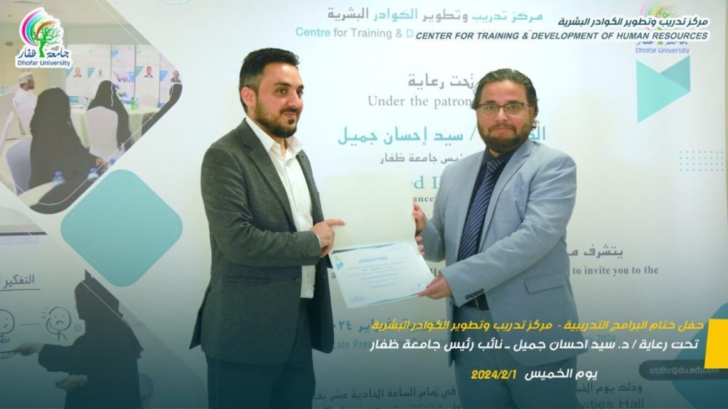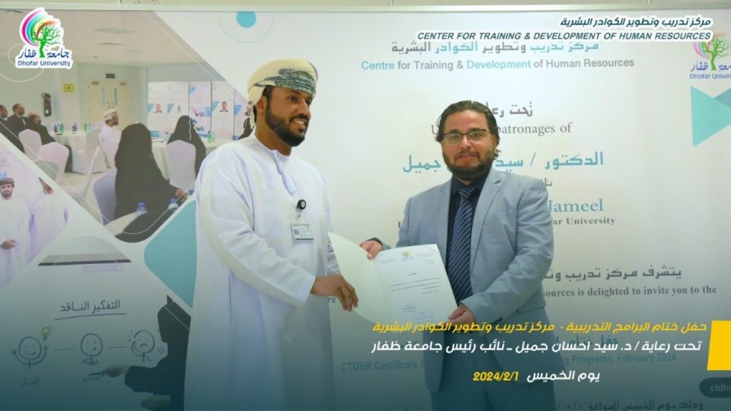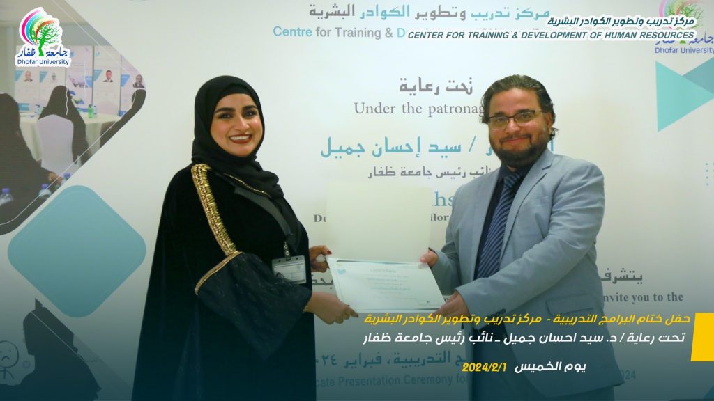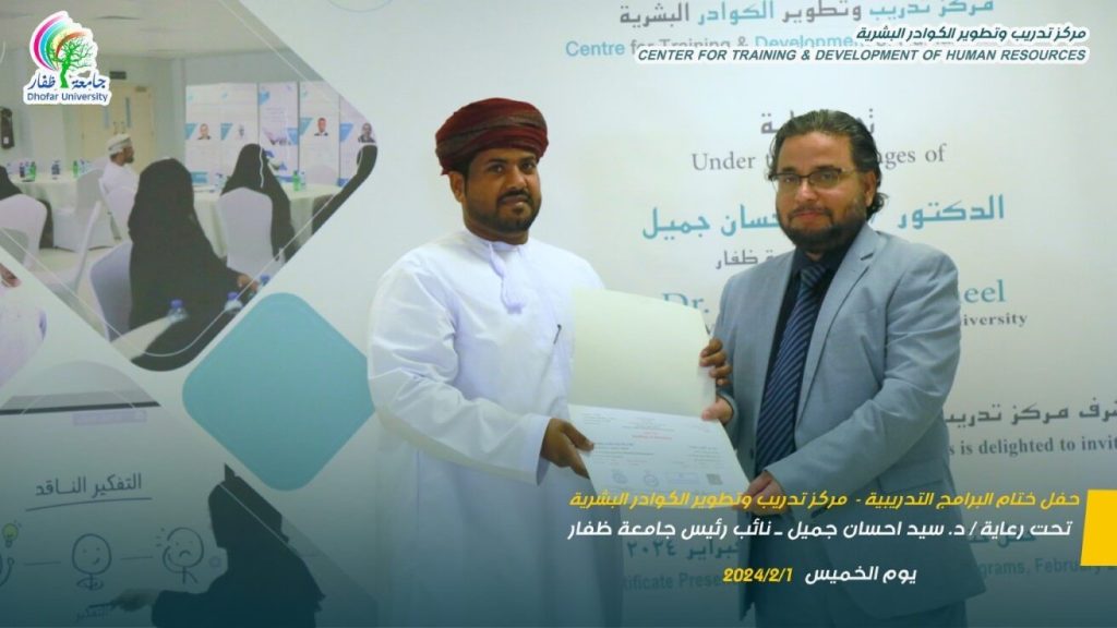 مركز تدريب وتطوير الكوادر البشرية بجامعة ظفار يسلم شهادات البرامج التدريبية لأعضاء الهيئة الإدارية