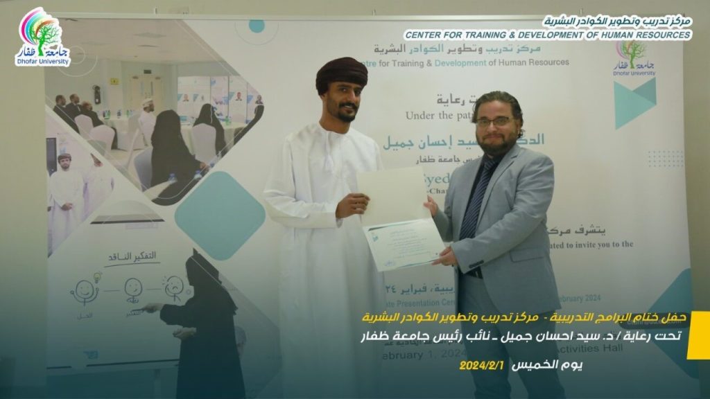 أقام مركز تدريب وتطوير الكوادر البشرية بجامعة ظفار في الأول من فبراير 2024 احتفالية بحضور نائب رئيس الجامعة د/ سيد إحسان جميل لتسليم شهادات تدريب البرامج التدريبية لأكثر من (100) من أعضاء الهيئة الإدارية بالجامعة،وأشار غازي الرواس مدير المركز أن استمرارية البرامج التدريبية للمركز تنبع من الالتزام بتنمية وتطوير مهارات الموظفين من أجل المساهمة الإيجابية لتحقيق أهداف الجامعة، ولا يتأتى ذلك إلا بتوفير بيئة تدريبية متميزة يتمتع بها المركز