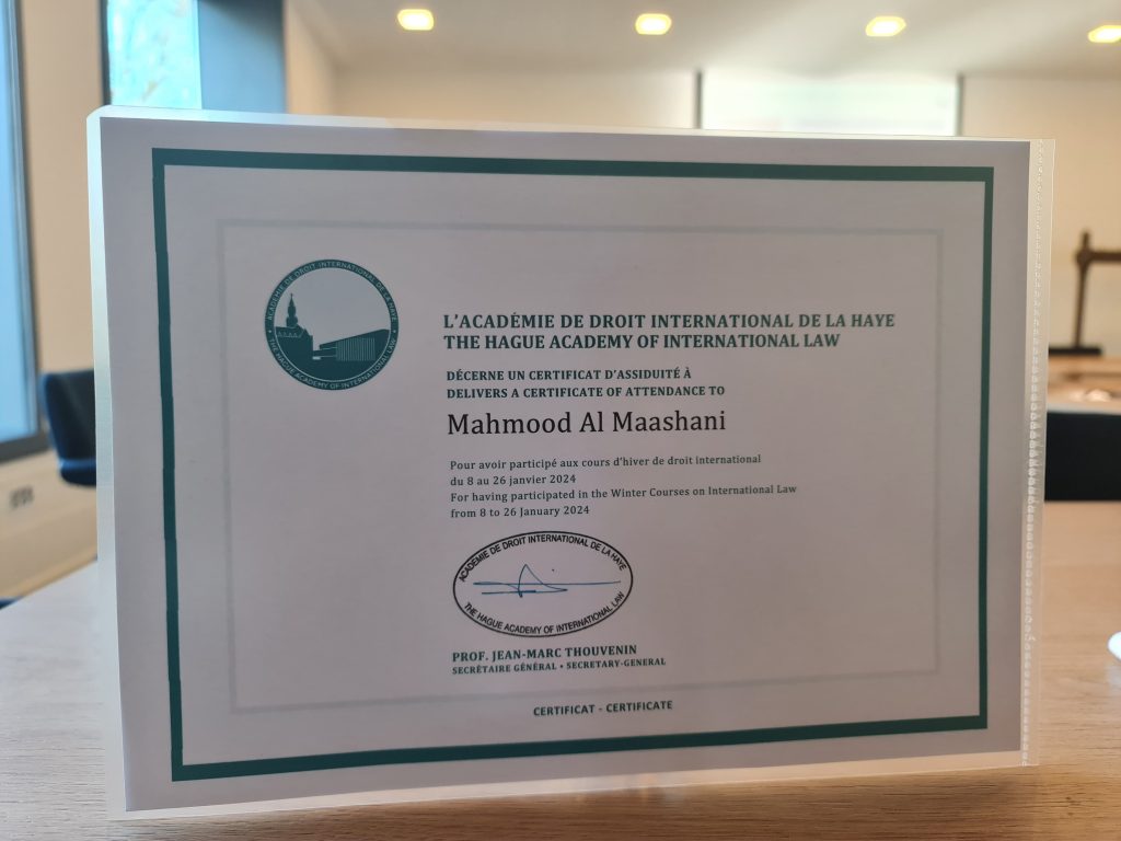 شارك محمود بن علي بن سهيل المعشني المحاضر في القانون العام بكلية الحقوق بجامعة ظفار في الدورة الشتوية للقانون الدولي 2024 والتي أقيمت في الفترة من 8-26 يناير 2023 بأكاديمية لاهاي للقانون الدولي- قصر السلام- مقر محكمة العدل الدولية