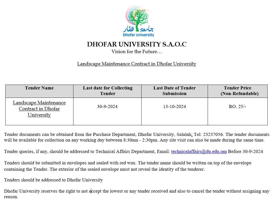 Landscape Maintenance Contract in Dhofar University – مناقصة عامة لخدمة التشجيير في الحرم الجامعي |