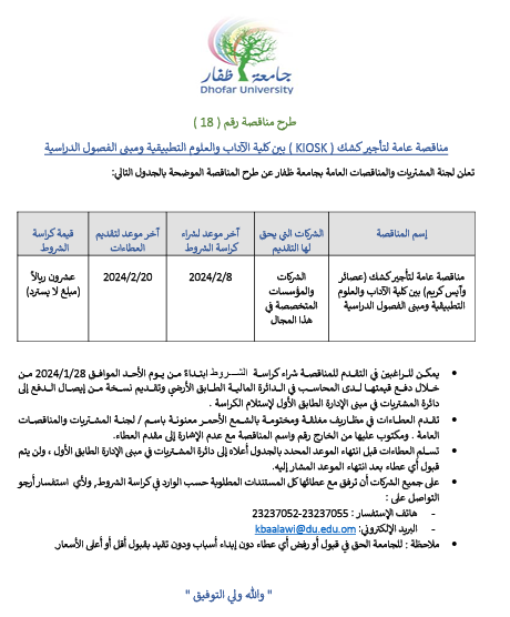 Dhofar University announced a tender of 2 kiosks |