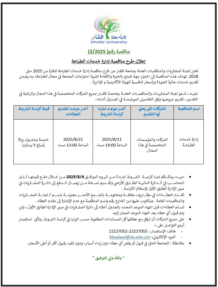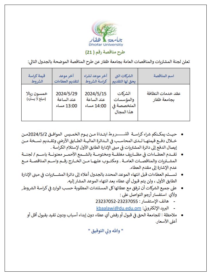 Dhofar University announced a tender of cleaning services |