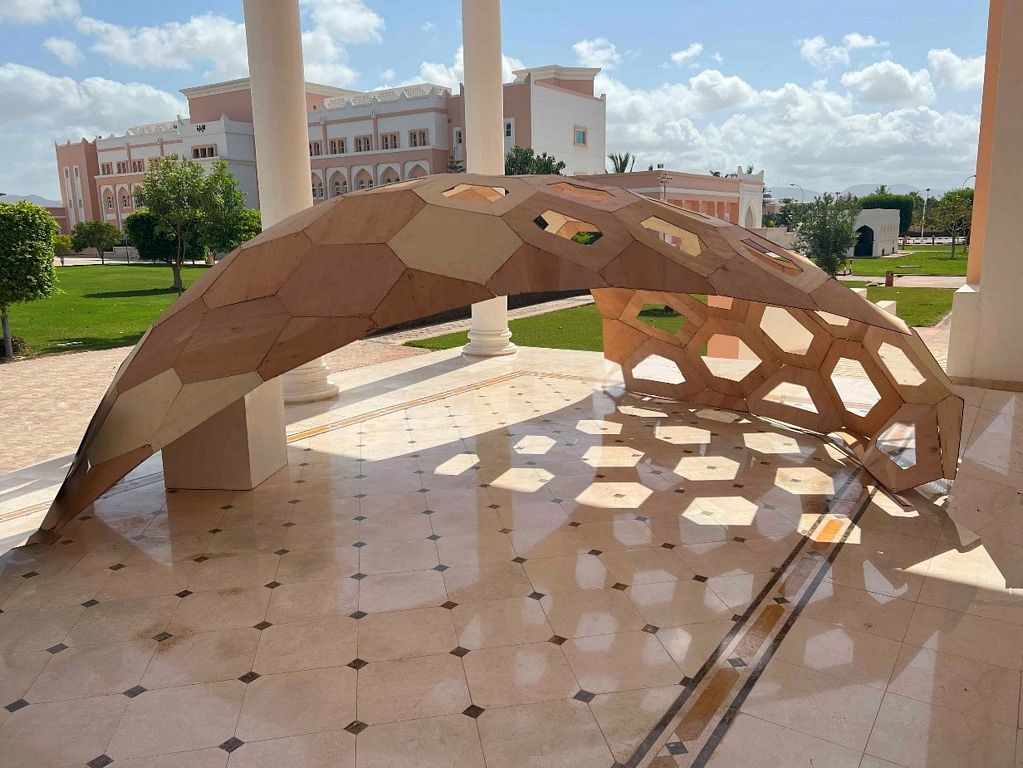 The students further undertook the design and construction of multiple installations on campus, one of which was called “The Knowledge Hub.” Located at the entrance of the College of Engineering, this pavilion took inspiration from Dhofar University’s role, facilitating the free flow of ideas and knowledge. The design of the installation incorporated algorithmic design techniques taught at prestigious universities across the globe. The pavilion’s cells were created using laser cutting technology available at Dhofar University’s workshop. The installation was assembled by the students and course leaders Dr. Yasser Arab and Ms. Maryam Saeed. The involvement of Interior Architecture students in Culture Week allowed them to apply design theories and fostered a sense of engagement and collaboration with students from other colleges.