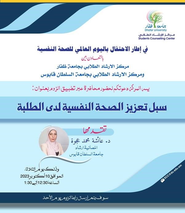 The center, in cooperation with the Student Counseling Center at Sultan Qaboos University, held a virtual lecture via the Zoom program presented by Dr. Aisha Ajwa, a psychologist at the Student Counseling Center at Sultan Qaboos University, under the title “Ways to enhance mental health among students” on Tuesday, 10/10/ 2023.